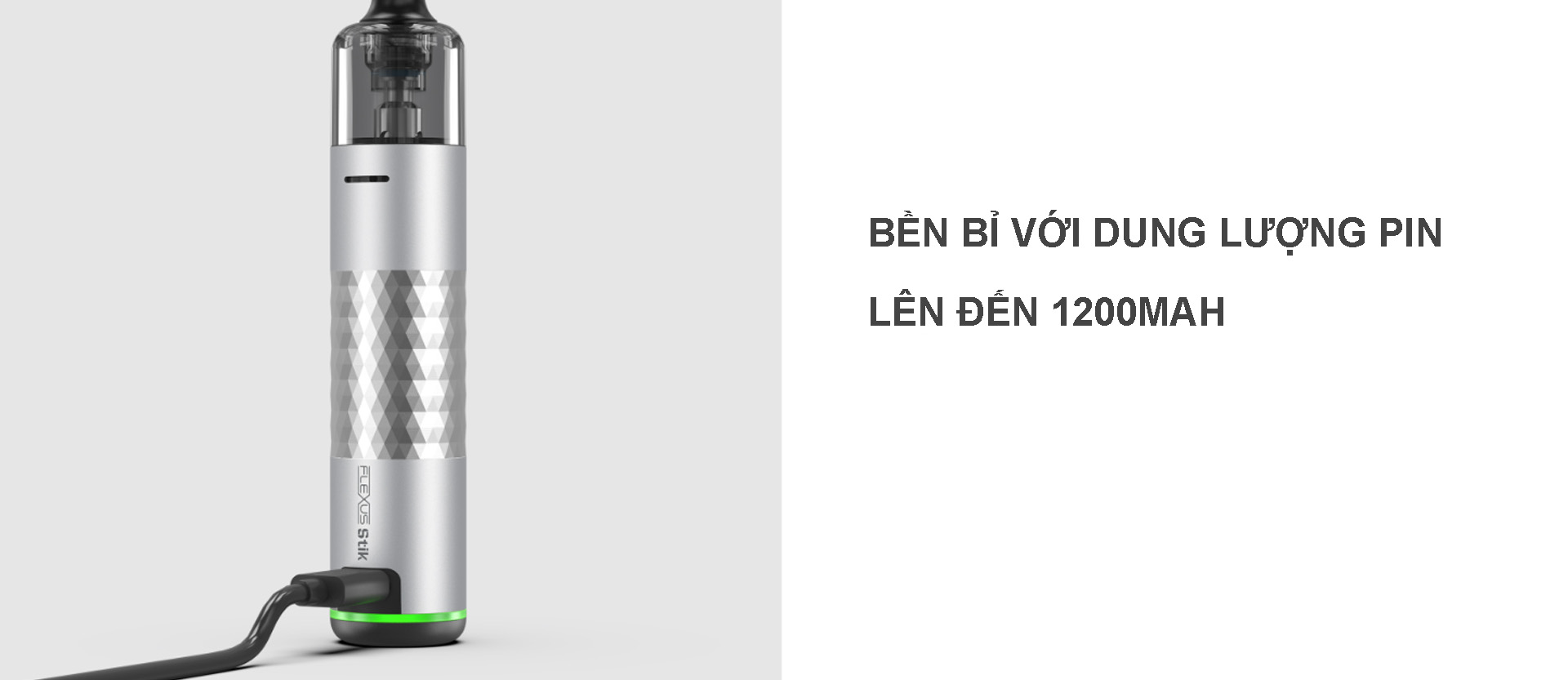 Flexus Stik được trang bị viên pin có dung lượng 1200mAh, một dung lượng khá cao cho một máy pod system nhỏ gọn. Với dung lượng pin này hoàn toàn có thể sử dụng trong thời gian dài lên tới 2 ngày và có thể hơn thế nữa, vì cũng tùy thuộc vào mức độ sử dụng của mỗi người.